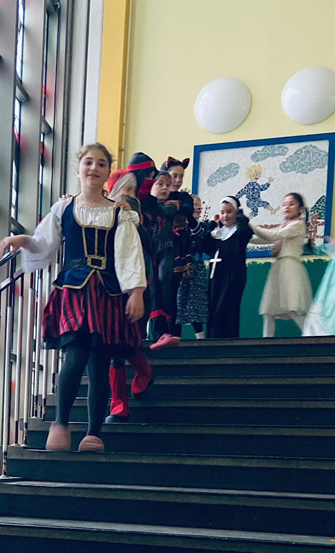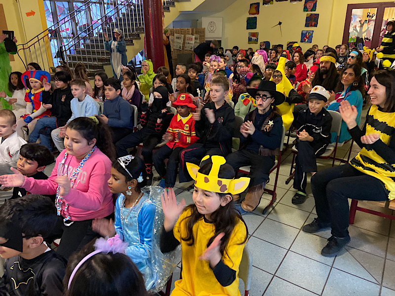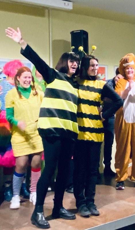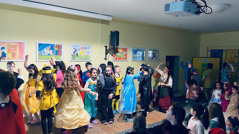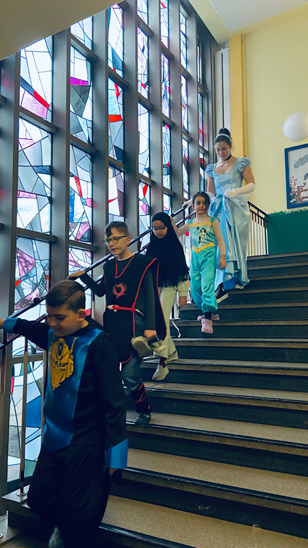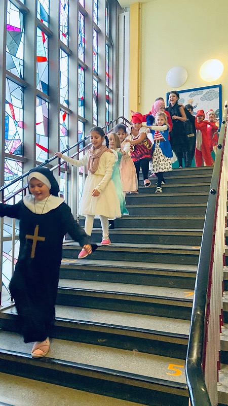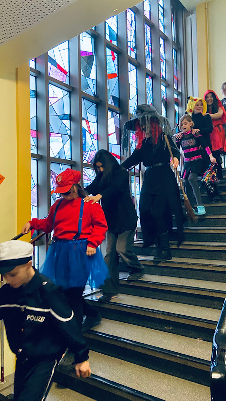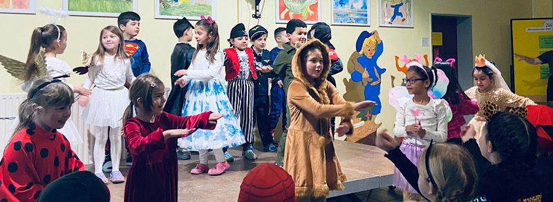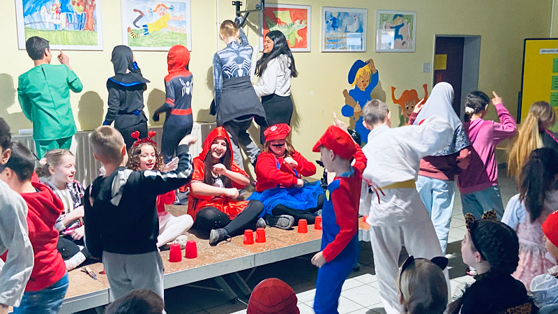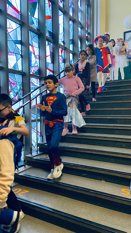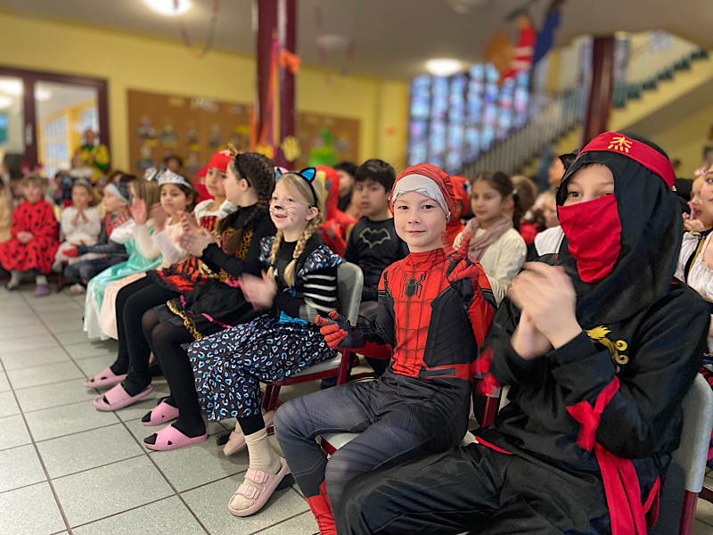 Unseren besonderen Applaus „Stampfen, Klatschen, Helau!“ hörte man wieder am 28.2. in der Eingangshalle. Die gesamte Schule feierte Karneval zusammen. Unsere Zirkusdirektorin (Frau Tigges) führte uns durch ein bunt gestaltetes Programm. Die Klassen hatten Lieder, Tänze, Pantomime und Montagsmaler zur Unterhaltung vorbereitet. Auch die vielen schönen Kostüme konnten alle Kinder und auch Erwachsene bestaunen. Dieses Jahr gab es ganz viele Prinzessinnen, Piraten, Ninjas, Batmans, Fußballspieler, Hasen, Katzen und Zauberer. Natürlich durfte die Polonaise durch die Schule nicht fehlen!