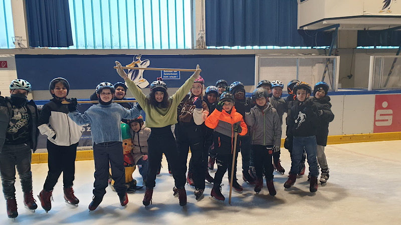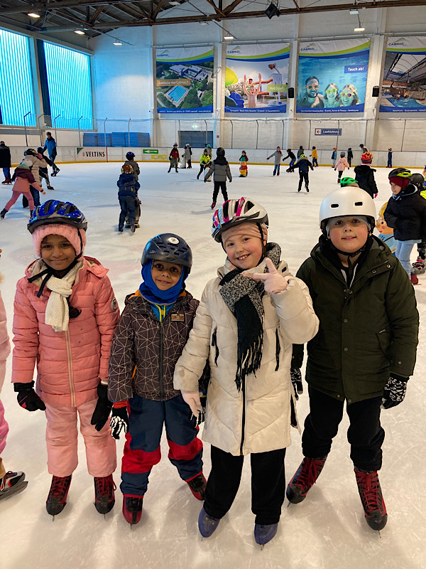 Am 17.1.25 war es wieder so weit und unsere Schule durfte in die Eishalle fahren. Alle Kinder hatten viel Freude auf dem Eis. Die älteren Schüler:innen haben den jüngeren Schüler:innen auf dem Eis geholfen. Zur Stärkung gab es warmen Tee und Kekse von Frau Pieper. Auf der kurzen Rückfahrt war es ganz still. Viele Kinder schliefen ein, da das Schlittschuhfahren so anstrengend war.