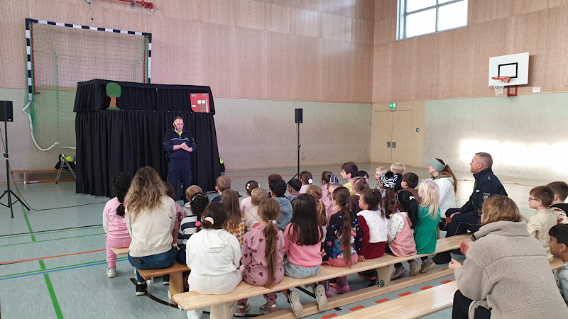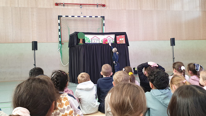 Heute war die Verkehrspuppenbühne der Polizei bei uns zu Besuch. Unsere 1.Klassen lernten mit Kaspar und Wuschel, wie man richtig die Straße überquert. Das war lustig!