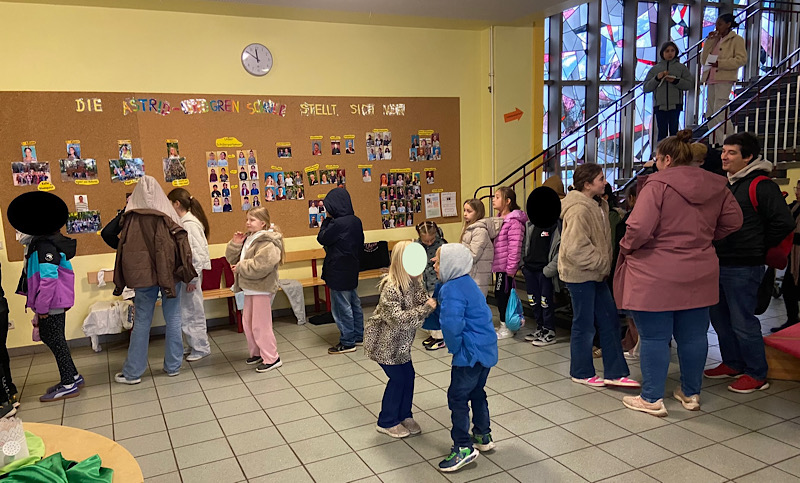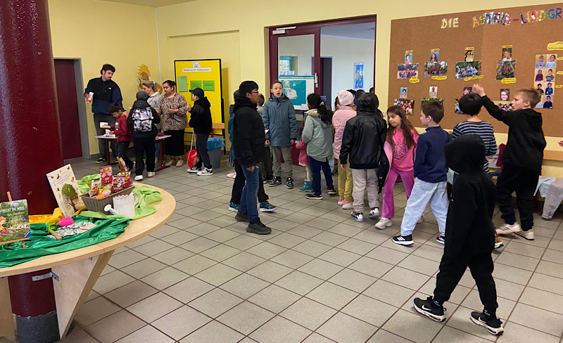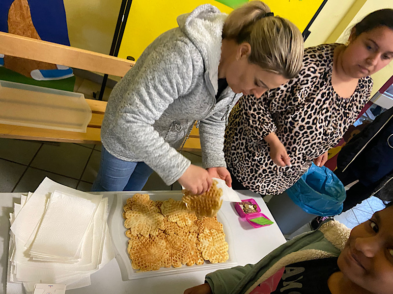 Die Kinder aus dem Schülerparlament wünschten sich mal wieder einen Waffeltag. Heute war es wieder soweit und jedes Kind bekam eine Waffel zum Frühstück. In der zweiten Pause war der Andrang in der Eingangshalle groß, dort durften sich die Kinder selbst eine Waffel kaufen.