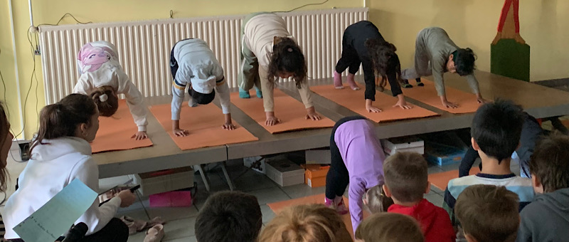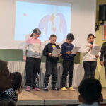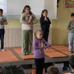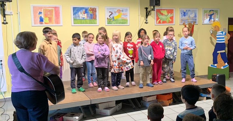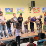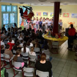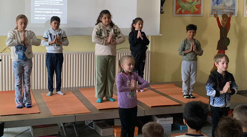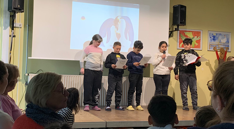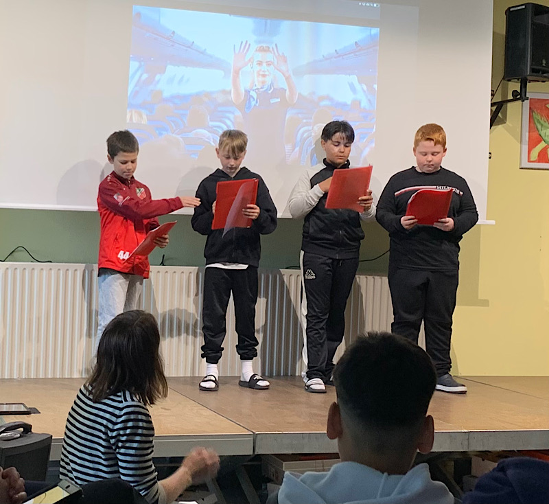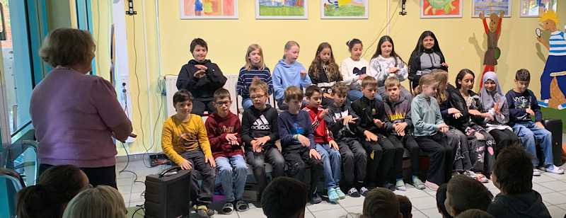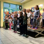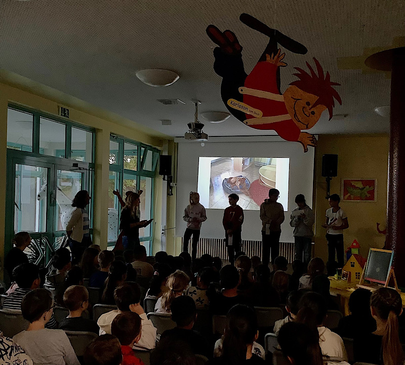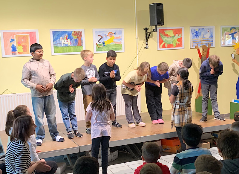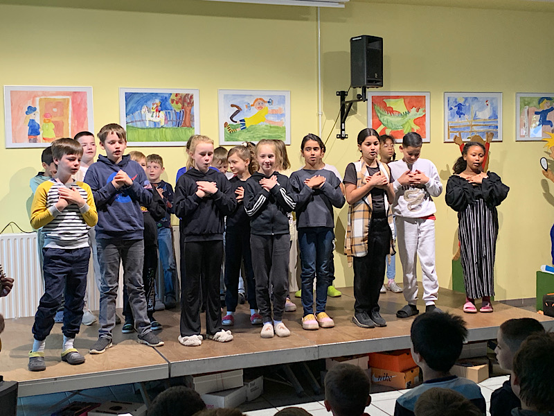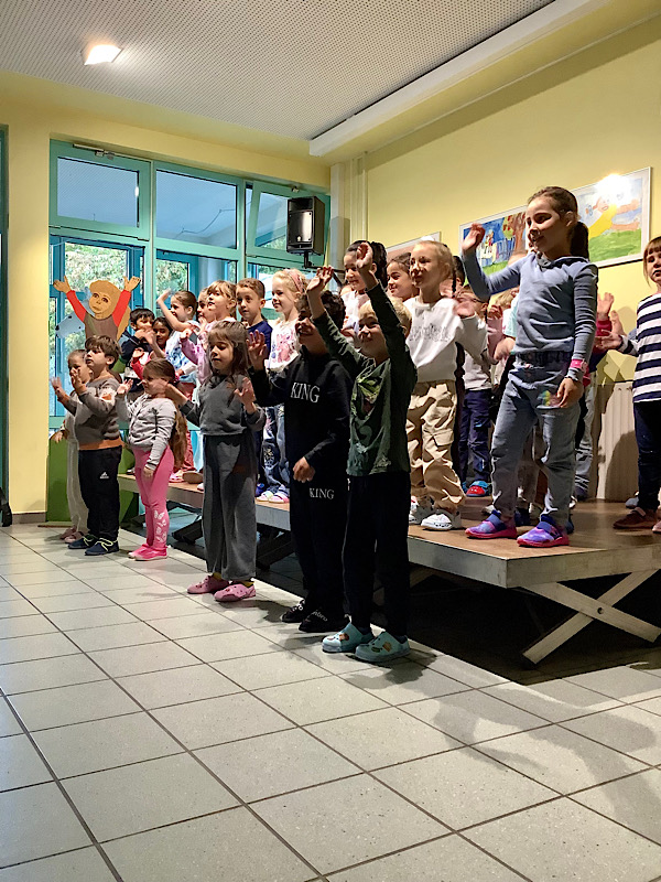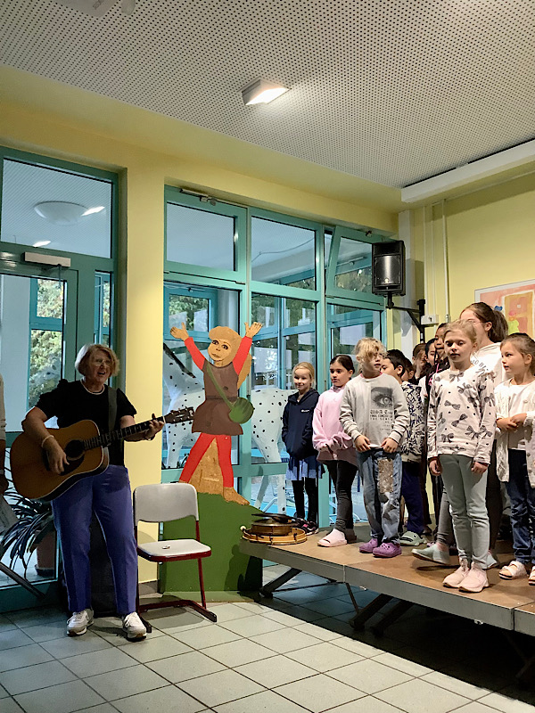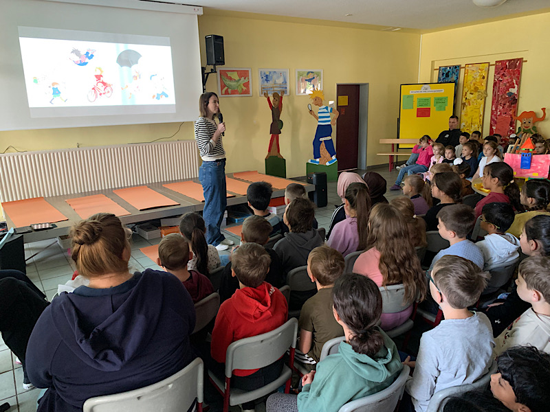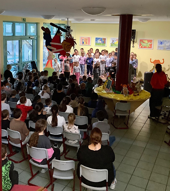 Einmal im Monat trifft sich die ganze Schule in der Eingangshalle, um gemeinsam den Start in die Woche zu feiern. Dort werden verschiedene Dinge aus dem Deutsch-/ Musik-/ und oder auch aus dem Sachunterricht präsentiert.